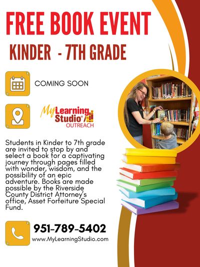 Students in Kinder to 7th grade are invited to stop by and select a book for a captivating journey through pages filled with wonder, wisdom, and the possibility of an epic adventure. Books are made possible by the Riverside County District Attorney’s office, Asset Forfeiture Special Fund.